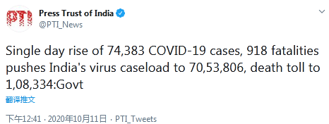 據報道,根據通報,過去24小時,印度新增74383例新冠肺炎確診病例,新增死亡病例918例,這使得該國累計新冠病例達到7053806例,其中死亡病例達到108334例。