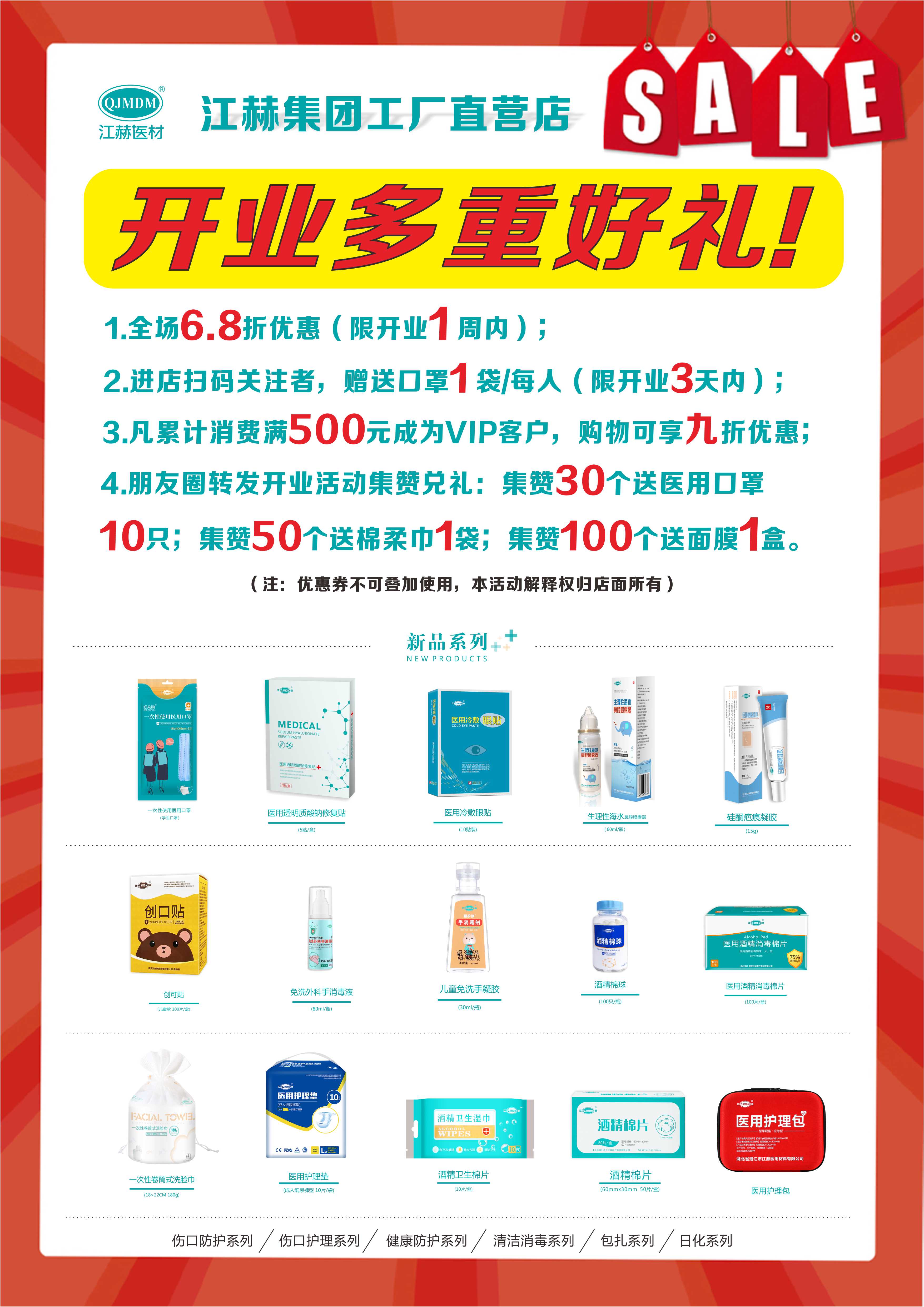 4. 朋友圈轉發開業活動集贊兌禮:集贊30個送醫用口罩10只;集贊50個送棉柔巾1袋;集贊100個送面膜1盒。