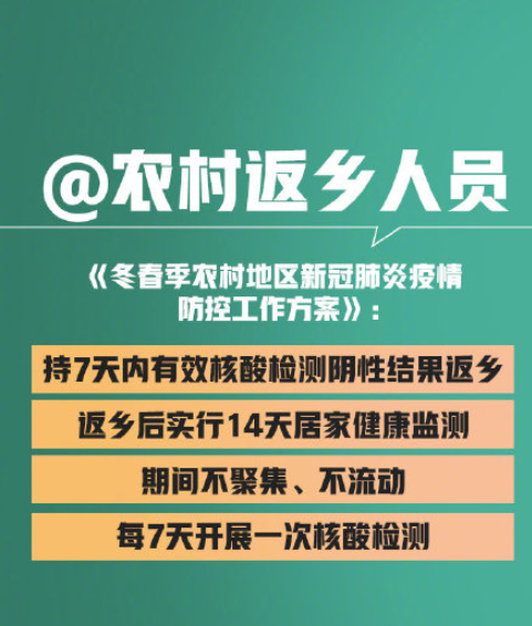 1月20日,國家衛生健康委發布了《關于印發冬春季農村地區新冠肺炎疫情防控工作方案的通知》,提出返鄉人員需持7天內有效新冠病毒核酸檢測陰性結果返鄉,返鄉后實行...